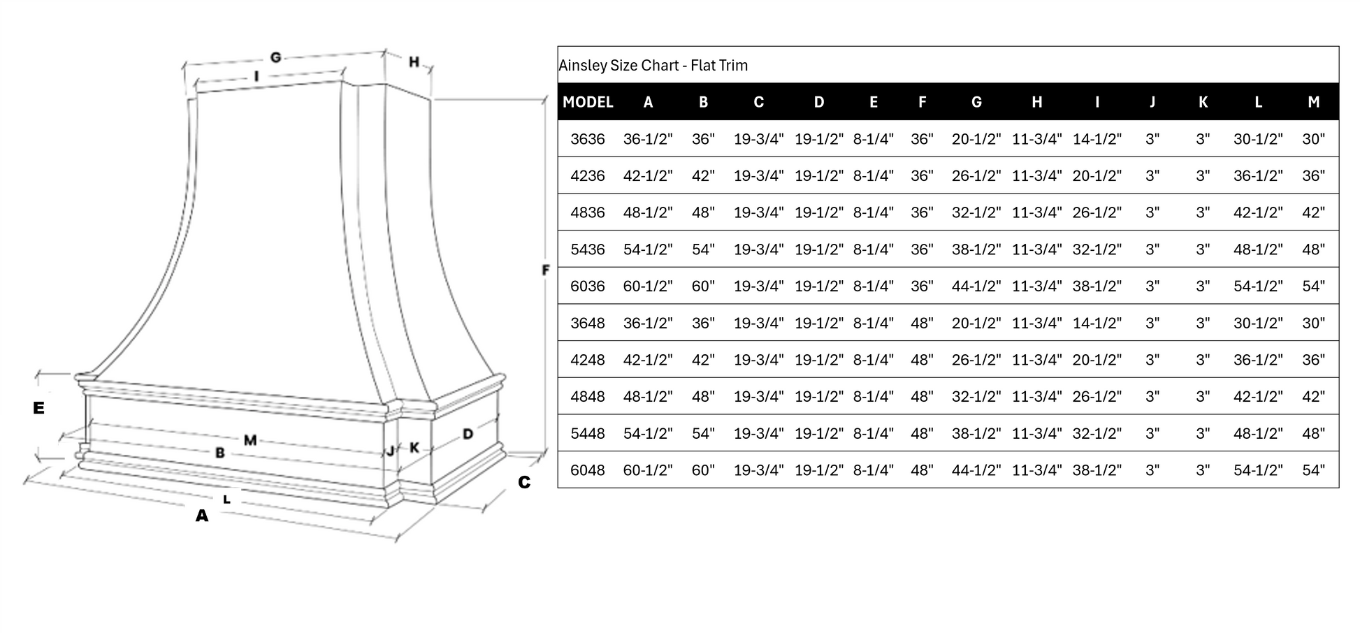 The total exterior width is the width of the hood plus the width of the trim molding. For example, for a 30″ wide hood with Ogee trim, the total exterior width will be 31.5″. For a 30″ wide hood with Flat trim, the total exterior width will be 30.5″.